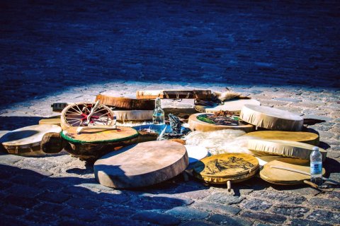 Herunder ligger min tromme sammen flere andre i en lille pause ved mit første store shamanistiske arrangement.